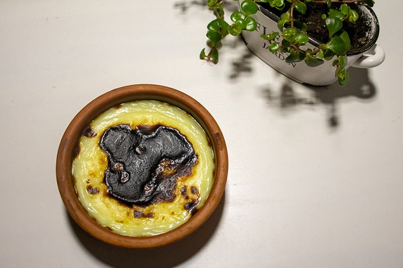 Pour the cornstarch mixture into the pot and continue stirring. Cook for 5 minutes and fill ovensafe dessert cups or clay cups with the rice pudding (sütlaç). Place them in a large baking tray and bake until nicely browned about 15-20 minutes.