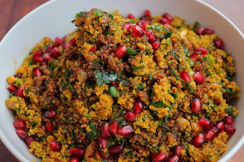 Add all the chopped greens, spices, pomegranate molasses, lemon juice, and salt into the bowl. Then mix all.